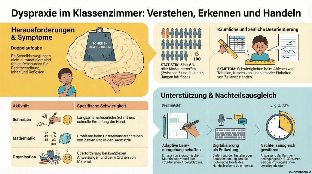 In der Schule ist strukturelles Arbeiten Standard, was für Dyspraxie-Kinder eine große Herausforderung darstellt. Zusätzlich muss das Kind viele neue Handlungsabläufe erlernen, abspeichern und umsetzen. Da ein von Dyspraxie betroffenes Kind dabei viel mehr Unterstützung bedarf als andere gleichaltrige Kinder, kommt es häufig nicht nur zu Schwierigkeiten beim Schreiben, sondern auch beim Linien einhalten, Ordnen und Wegheften von ausgeteilten Zetteln und weiteren schulischen Aktivitäten.
