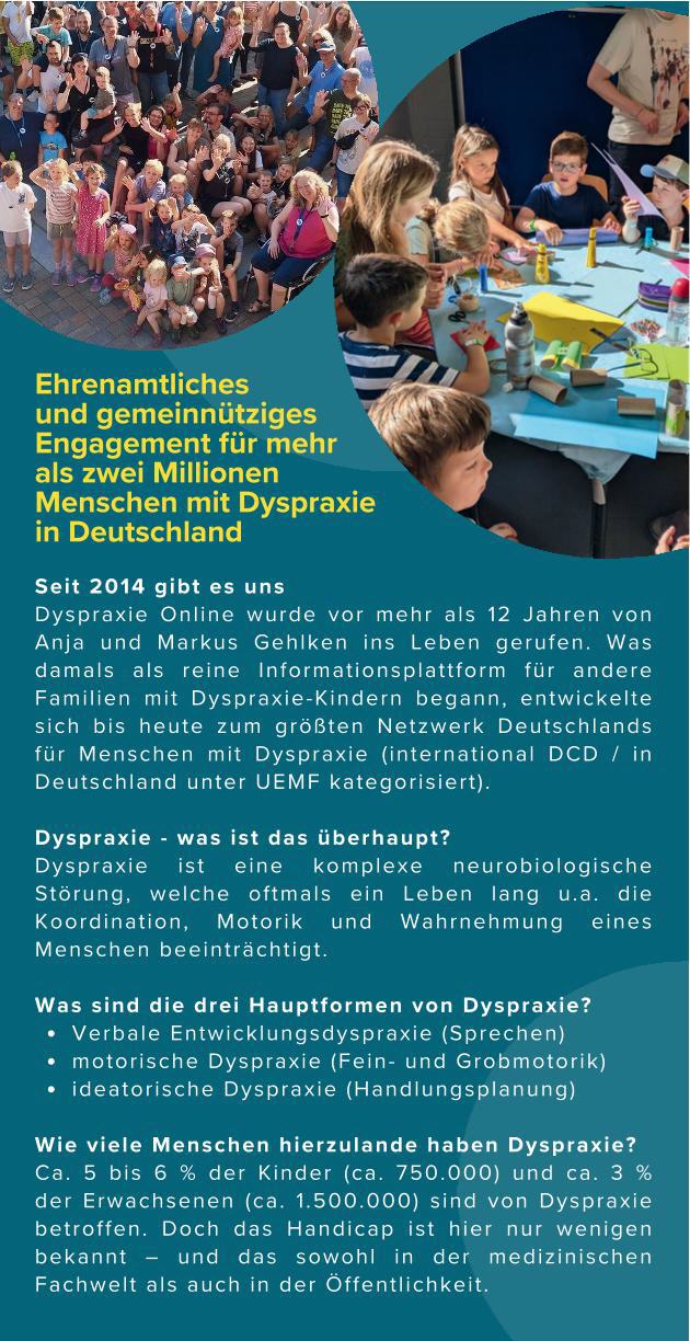 - Weiterentwicklung der seit 2022 bestehenden Dyspraxie-Deutschland-Woche (kurz DysDW) von einer reinen Online-Veranstaltung in eine hybride Veranstaltung