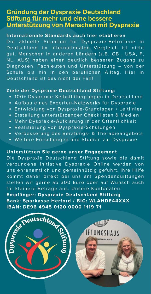 - Verbesserung des Beratungsangebots zur Dyspraxie (durch weitere Printmedien sowie regelmäßige telefonische Sprechzeiten für Betroffene) – seit Anfang 2025 gibt es hier bereits eine eigene Hotline-Nummer
