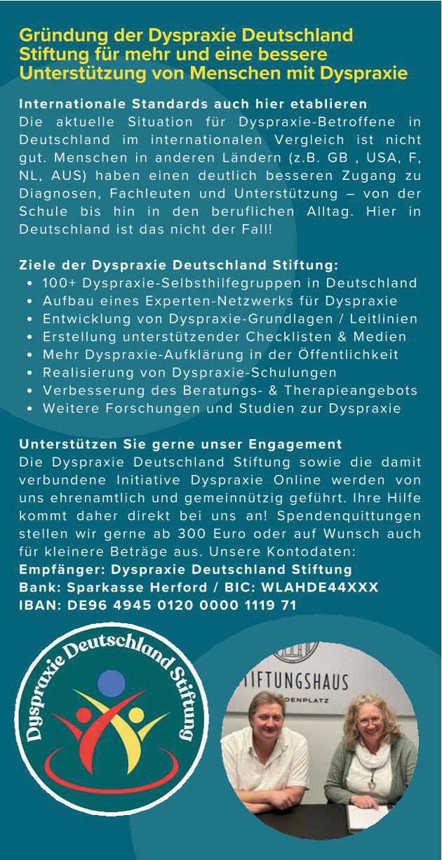 Die Dyspraxie Deutschland Stiftung soll die Basis, die durch Dyspraxie Online geschaffen wurde, weiterentwickeln und die Anerkennung des Handicaps Dyspraxie in Deutschland sowie den Umgang mit Dyspraktikern fördern und unterstützen. Ziele, die u.a. mit der DysDS verfolgt werden: